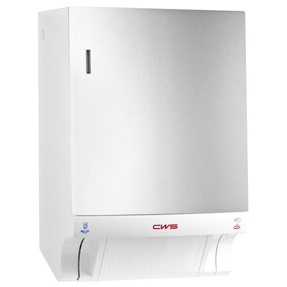 The CWS boco plastic silver touchless cotton towel dispenser is a stylish, reliable and shiny stainless steel roll towel dispenser. This product is made of high-quality ABS plastic, has an inspection window and is locked with a key. Its automatic dispensing ensures that towels are always available for use. The towel roll has separate compartments for the dirty and clean parts of the roll; thanks to this, there are no problems with contamination in the bathroom.