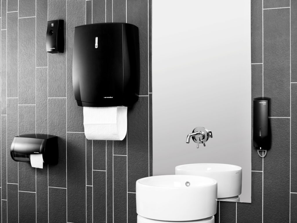 The combination of black and white, known as the perfect duo, is not only very popular but also often used when arranging the interiors of homes and public places. These colors are an excellent solution for rooms that should feature a simple and modern style, easy to keep clean, and give the interior an elegant character. In addition to the attractive appearance, convenience often goes hand in hand, as black-and-white bathroom elements, created with the user's luxury in mind, are made from the highest quality materials and equipped with sensors for touch-free operation. Such accessories include photo-cell activated automatic paper towel dispensers, dedicated liquid soap dispensers, and spacious toilet paper dispensers. Additionally, since sanitary accessory manufacturers treat their black product lines dedicated to public toilets very comprehensively and seriously, it is extremely easy to design a public restroom using such lines as Bisk Masterline, JM-Metzger Cosmos, Katrin Inclusive, or SANITARIO Negro.