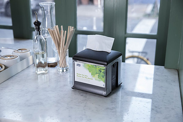 Los dispensadores de servilletas Tork están diseñados de tal manera que dosifican servilletas una a una. De esta manera, el cliente toma solo una hoja a la vez, lo que provoca que otra hoja se deslice parcialmente hacia afuera. No hay desperdicio, se reduce la cantidad de residuos y el personal puede dedicar parte de su energía a otras tareas en lugar de rellenar los dispensadores de servilletas y eliminar residuos.