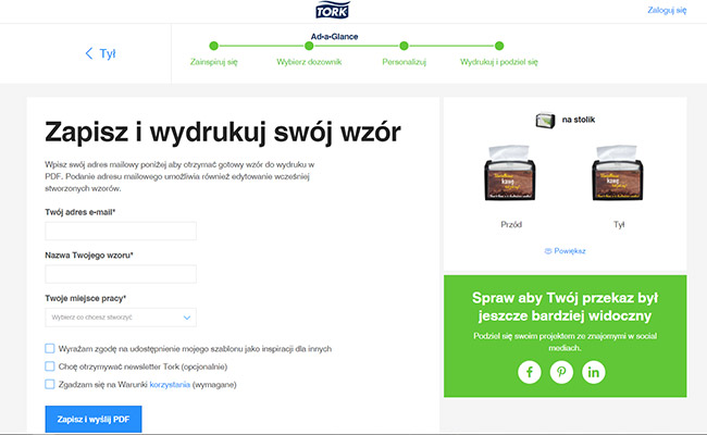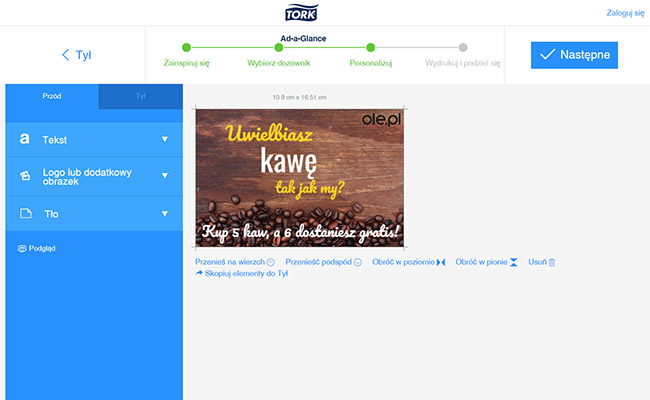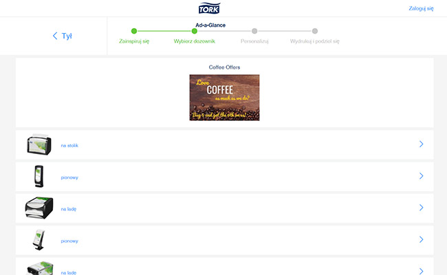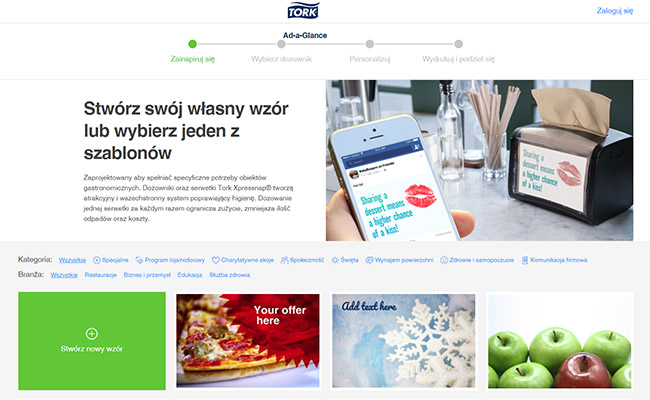 En este momento, algunos pueden pensar: está bien, pero no sé cómo crear diseños gráficos y no quiero gastar más dinero en un diseñador. La marca Tork ha atendido las necesidades de los clientes de la industria HoReCa y ha facilitado al máximo la creación de anuncios. En su sitio web Tork han colocado un sencillo programa gratuito para crear anuncios llamado Ad-a-Glance.
