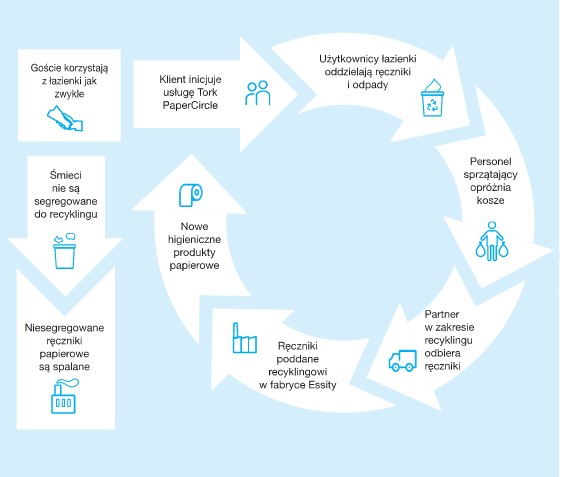 Firma Tork führt Lösungen ein, die sich positiv auf den Umweltschutz auswirken. Das umweltfreundliche Unternehmen orientiert sich in seinen Aktivitäten an nachhaltiger Entwicklung. Um den Kreislauf im Bereich der Unternehmensaktivitäten zu schließen, wurde der Tork Paper Circle-Service eingeführt, der sich auf das Recycling von gebrauchten Papiertüchern konzentriert. Die von Unternehmen, Krankenhäusern, Einrichtungen und öffentlichen Orten transportierten Tork-Tücher werden in der Essity-Fabrik recycelt und erneut verwendet.