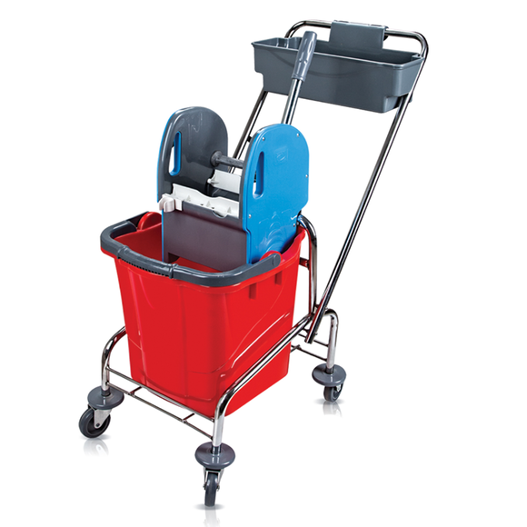 Jednokbelový úklidový vozík i přes své malé rozměry výrazně usnadní úklid v menších firmách a institucích. Je vybavena kbelíkem šedé barvy o objemu 18 litrů s pohodlným madlem na přenášení. Koš připevněný k rámu umožňuje přepravovat produkty potřebné k čištění, např. Čelisťový lis umožňuje snadné vytlačení špinavé vody. Díky otočným kolům se kočárek extrémně snadno přepravuje.