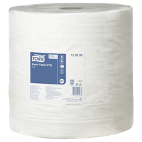 Das doppellagige Papierreinigungstuch Tork Universal in einer großen Rolle besteht aus weißem Zellstoff. Tork Reinigungstücher sind für stark beanspruchte Bereiche konzipiert.