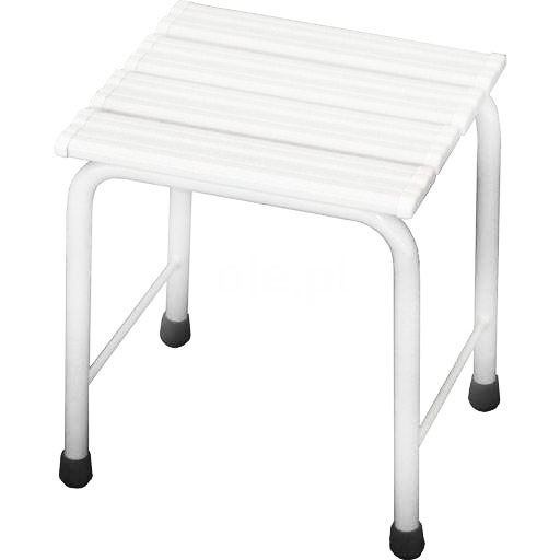 Badezimmerhocker für ältere und behinderte Menschen. Die stabile Struktur besteht aus weiß lackiertem Kohlenstoffstahl. Das Ganze sieht ästhetisch ansprechend aus und ist leicht sauber zu halten. Der freistehende Hocker ist verschiebbar, was besonders in Badezimmern, die von behinderten und körperbehinderten Menschen genutzt werden, nützlich ist.