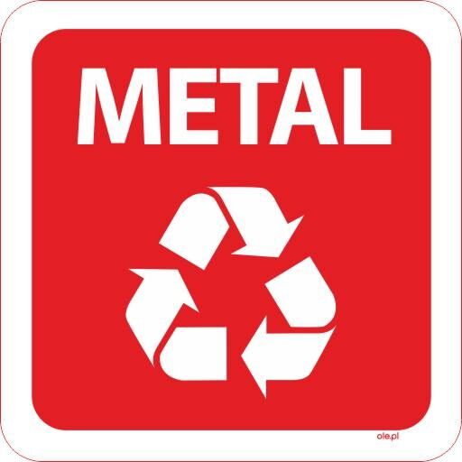 Quadratischer Aufkleber für Müllsortierbehälter und Müllwagen. Das selbstklebende Etikett zeigt den Schriftzug METAL und das Recycling-Symbol auf rotem Grund. Der Aufkleber „Metall“ erleichtert die ordnungsgemäße Mülltrennung.