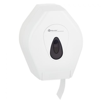 Maxi-Midi-Top aus massivem weißem Kunststoff mit grauen Elementen. Der handliche Spender ist mit Papierrollen mit einem Durchmesser von 23 cm gefüllt.