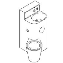 Sanitärset „Waschtisch + Toilettenschüssel“ aus Edelstahl, matt geschliffene Oberfläche, zur Wandmontage, mit integrierten Elektronikelementen Beschläge. Verdeckte Befestigung mit doppelseitigen Schrauben, verschließbare Revisionsöffnung. Auf dem Boden stehende Säule, Materialstärke 2 mm, erhöhte Rückwand mit integriertem Wasserauslauf und Piezo-Taster mit Start-/Stopp-Funktion. Ovale Waschtischschale nahtlos mit der Säule verbunden, Siphon aus Kunststoff. Nahtlos verschweißte Aussparung zur Aufbewahrung von Toilettenpapier. Geschweißtes Edelstahl-Trichter-WC, Materialstärke 1,6 mm, mit bodenlang umlaufender Schürze, Positionierung des WC-Beckens auf der linken Seite im 45°-Winkel. Beckenrand gegen Verdecken geschützt, Spülauslösung über Piezo-Taster, Spülleistung zertifiziert nach EN 997, horizontaler Heckablauf DN 100. Magnetventil zum Anschluss von vorgemischtem Wasser oder Kaltwasser. Verdeckter Wassertank mit Anti-Kondensations-Isolierung, konstante Spülkapazität (9 oder 6 l). Anschlussspannung 24 V DC. Montagesatz im Lieferumfang enthalten.