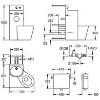 Sanitärset „Waschtisch + WC-Becken“ aus Edelstahl, matt polierte Oberfläche, zur Montage mit der Rückseite zur Wand Hinter dem Serviceraum befindet sich ein Serviceraum mit entfernten elektronischen Armaturen, die im Serviceraum montiert sind. Gewindestangen zur vandalensicheren Montage auf der Serviceraumseite. Auf dem Boden stehende Säule, Materialstärke 2 mm, erhöhte Rückwand mit integriertem Wasserauslauf und Aktivierungsknopf. Ovales Waschbeckenbecken nahtlos mit der Säule verbunden, Siphon aus Kunststoff, Ablauf DN 40. Nahtlos eingeschweißte Aussparung zur Aufbewahrung von Toilettenpapier. Geschweißtes Edelstahl-Trichter-WC, Materialstärke 1,6 mm, mit bodenlang umlaufender Schürze, Positionierung des WC-Beckens rechts im 45°-Winkel. Der Beckenrand ist vor eindringenden Fremdkörpern geschützt, Spülleistung zertifiziert nach EN 997, horizontaler Rückablauf DN 100. Selbstschließendes Kugelventil mit Fernauslösung zum Anschluss an vorgemischtes Wasser oder Naturwasser, selbstschließend mit Anti- Rückprallschutz. Verdeckter Wassertank mit Anti-Kondensations-Isolierung, konstante Spülkapazität (9 oder 6 l). Montagesatz im Lieferumfang enthalten.