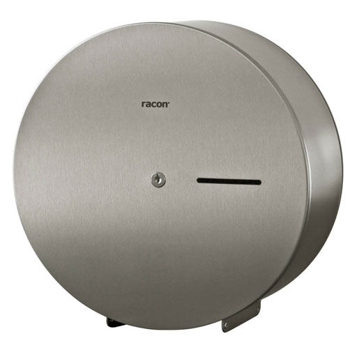 Stahlbehälter für Toilettenpapier in großen Jumbo-Rollen. Papierzuführung für öffentliche Räume mit hohem Verkehrsaufkommen. Großer Wandbehälter mit schlichtem Design.