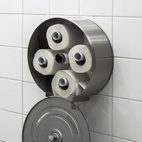 Sehr geräumiger Toilettenpapierspender mit einer Kapazität von vier Rollen. Aus Edelstahl. Das abschließbare Gehäuse schützt vor dem Zugriff Dritter. Vier Gucklöcher erleichtern die Kontrolle des Füllstands der Kartusche und das schnelle Füllen von Lücken. Papierbehälter für stark frequentierte Toiletten.