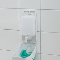 Loketní dávkovač ze série Salamanca je vyroben z bílého ABS plastu s tyrkysovým tlačítkem. Kapacita 750 ml zajišťuje méně časté doplňování. Zásobník určený k montáži na stěnu, ideální pro lékařské a kosmetické salony, výrobní haly atd.