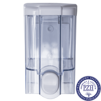 Un pequeño dispensador de jabón con capacidad de 500 ml fabricado en plástico ABS, apto para instalaciones de servicios públicos, como: aseos, cocinas, oficinas, instalaciones sociales, etc. El dispensador de jabón pertenece a la serie JET, que se caracteriza por una carcasa transparente y que ha recibido un certificado higiénico del Instituto Nacional de Salud Pública (PZH). El dispensador de jabón está fijado permanentemente a la pared y se puede utilizar cualquier jabón líquido