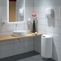 Montado en la pared, es cómodo de usar y garantiza un mayor nivel de higiene. El contenedor se rellena con rollos de papel en el sistema T6, y es perfecto para baños con tránsito medio.