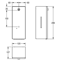 Zasilany 6 bateriami AA Mignon 1,5 V, dozownik jest energooszczędny i łatwy w obsłudze. Wbudowana dioda LED sygnalizuje niski poziom baterii, zapewniając nieprzerwane działanie urządzenia. Kompaktowe wymiary (wysokość: 296 mm, szerokość: 120 mm, głębokość: 107 mm) sprawiają, że dozownik pasuje do każdego wnętrza, nie zajmując zbyt wiele miejsca.