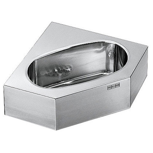 Single wall-mounted washbasin, corner. Stainless steel, matt polished surfaces, material thickness 1 mm. Seamlessly welded basin with dimensions of 290 x 155 x 100 mm, rectangular shape. No transfer. Fittings shelf. Strainer drain 1 1/4˝ centered. Front panel with 45° cut corners. Screws and wall plugs included.