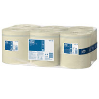 Tork Universal paper towel roll in a central dispensing system that allows for quick replacement of rolls. The yellow towel is used to dry hands and wipe water from surfaces. Suitable for high-wear areas. Approved for use in places where there is contact with food.