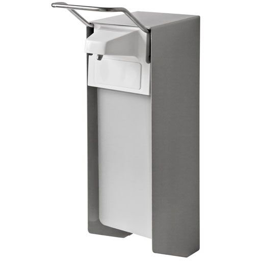 Dispenser designed for disinfectants or liquid soap. Wall-mounted, thanks to the elbow lever it allows for hygienic and comfortable use. Recommended as an element of equipment in hospitals and other facilities where a high level of hygiene plays an important role.