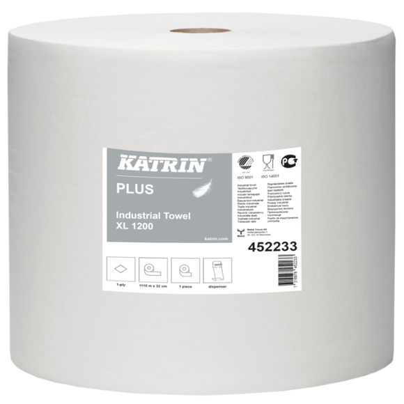 Industrial fibrous cloth in a roll, Katrin Plus Industrial Towel XL 1100m, 1 layer of white cellulose.