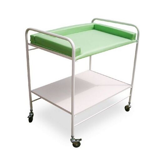 Mobile baby changing station. The changing table is equipped with an additional, practical shelf and wheels for easy movement. The table is made of the highest quality materials. Fully washable upholstery guarantees hygienic use, and the raised sides prevent falling and ensure safety. The changing table is perfect for public facilities.