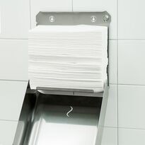 The LUNA folded paper towel container is characterized by careful workmanship and modern design. The dispenser is designed for standard-sized disposable towels and holds approximately 600 sheets. The Faneco paper towel dispenser goes very well with other hygiene accessories from the LUNA line with a characteristic "S"-shaped peephole.