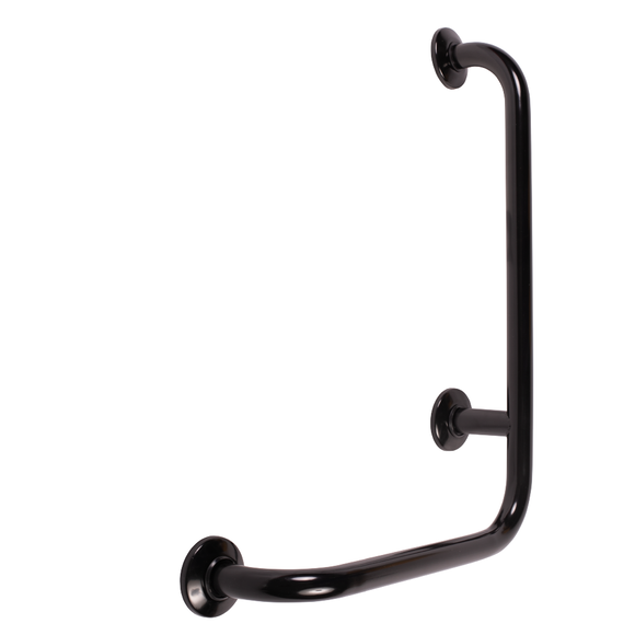 An angular handrail bent at an angle of 90º into the shape of the letter "L" will be used in a bathroom for the disabled. Made of black powder-coated carbon steel, it has three mounting points that provide stability. The vertical arm of the handle is 60 cm long and the horizontal one is 40 cm long. The handle will work well in the shower or next to the toilet bowl for disabled people. The set includes: handle, covers, screws and dowels.