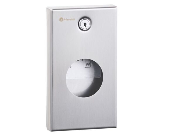 Steel hygiene bag dispenser with a matte surface finish. The container is equipped with a solid steel cylinder lock flush with the surface. The hygiene bag dispenser made of the best quality materials is part of the Merida Stella series.