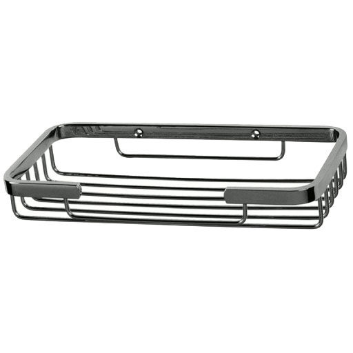 A rectangular openwork soap dish, mounted to the wall with screws. Made of chrome-plated stainless steel.