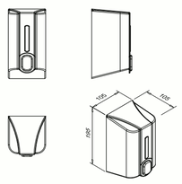 The dimensions of the dispenser are: height 195 mm, width 105 mm, depth 108 mm, and the activation method is a button. The dispenser has a viewfinder that allows you to check the soap level inside and a non-spill valve that prevents soap leakage.