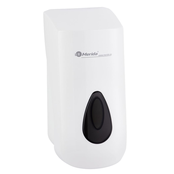 Plastic liquid soap dispenser with a capacity of 800 ml, designed for wall mounting. The container is equipped with an inspection window that guarantees constant control of the amount of the insert. White housing with a gray window. The container can be refilled multiple times from the canister.