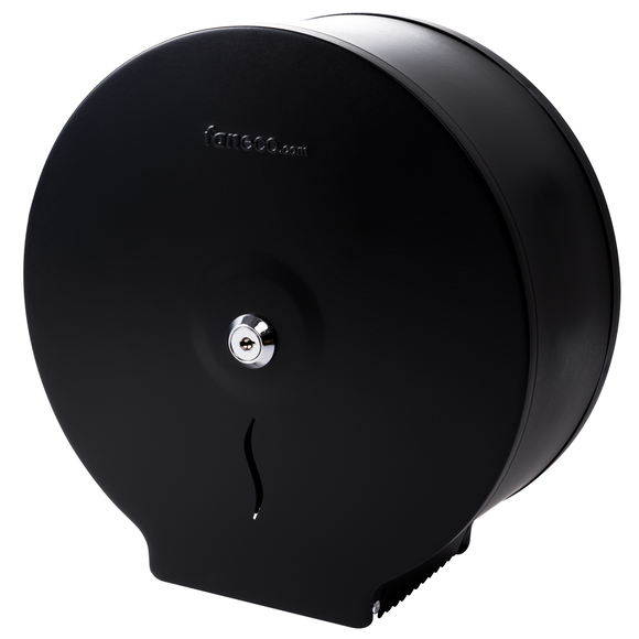 Made of powder-coated stainless steel, a black container for toilet paper in medium-sized JUMBO rolls is a perfect solution for public bathrooms designed with high aesthetics and resistance to intensive use in mind. The Faneco Hit metal container is equipped with a lock and key that additionally secure the roll. Resistant to acts of vandalism, it works well in toilets with high traffic.
