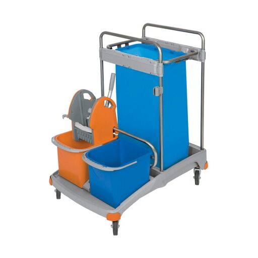 A professional cleaning set dedicated to use on large surfaces. The cleaning service trolley is equipped with two 20-liter buckets, a mop press and a 120-liter bag holder. The cleaning set is placed on a solid base with bumpers and equipped with a discreet handle for attaching a mop stick. Swivel wheels enable efficient control. The trolley is perfect for cleaning commercial facilities, sports facilities, office spaces, etc.