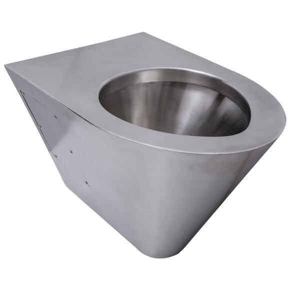 Steel toilet bowl adapted for installation with a manual or automatic flushing system. Recommended for use in heavily used public toilets, such as railway stations, prisons, stadiums and public toilets in other facilities. Vandal-proof design without edges, easy to keep clean, suitable for hanging.
