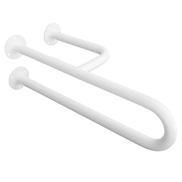 Pasamanos fijo para aseos para personas con discapacidad con 3 puntos de apoyo que le aportan estabilidad. El mango fijado en el lado derecho tiene 60 cm de largo y está fabricado en acero al carbono pintado de blanco. El pasamanos viene con un kit de montaje: tacos y tornillos.