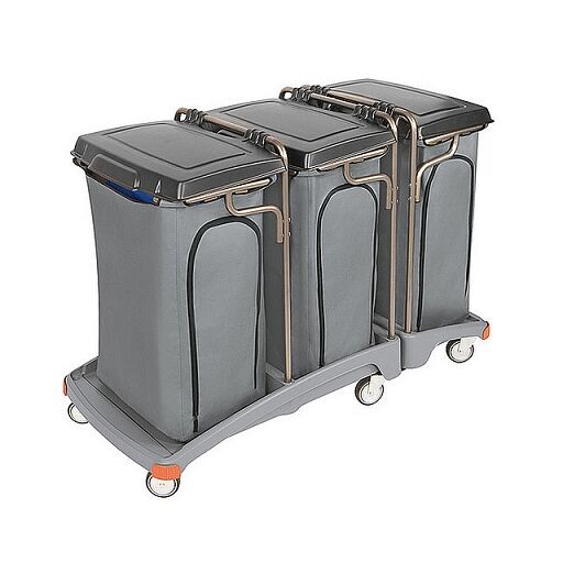 Un carrito triple bien equipado para residuos y ropa sucia. Gracias al uso de fundas y bolsas protectoras con bolsas de aluminio en su interior, es posible recoger y transportar los residuos de forma discreta y estética. Una base de plástico sólido y un marco de acero inoxidable hacen que el cochecito pueda soportar un uso intensivo. El cochecito es cómodo de conducir y los parachoques en la base reducen el riesgo de dañar las superficies. Recomendado para instalaciones grandes y medianas.