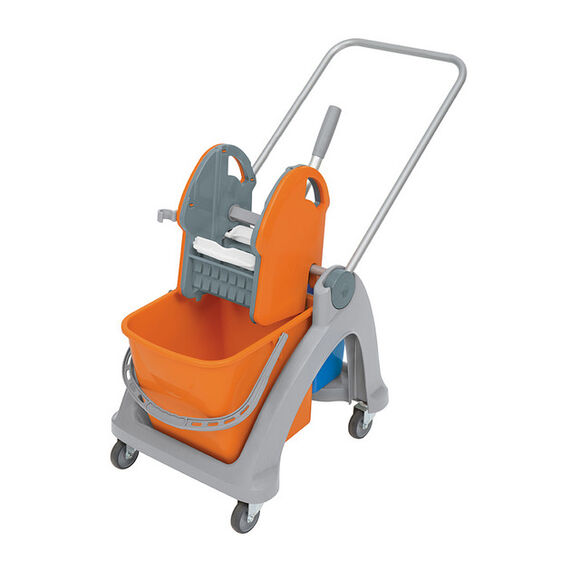 Carro móvil de plástico colocado sobre ruedas de goma autogiratorias que funcionan silenciosamente y no rayan el suelo. Diseñado para la limpieza de superficies medianas y grandes. La base de la silla de paseo está equipada con un asa extraíble de aluminio. Dos cubos de 25 y 6 litros de capacidad permiten separar el agua limpia del sucia, lo que facilita enormemente la limpieza de las superficies. El carro de limpieza cuenta con una prensa eficiente con alta eficiencia en el exprimido de las fregonas, gracias a la cual los pisos se secan más rápido. El sistema está fabricado con materiales ligeros, duraderos y fáciles de usar de alta calidad.