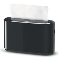 Dispensador de toallas de papel Tork Multifold. Diseñado para colocarse sobre una encimera, protege las toallas de la humedad y facilita el mantenimiento del orden. El dispensador de toallas de papel está fabricado en plástico ABS de color negro. Las toallas se dispensan sacando una hoja. Delgado, no ocupa mucho espacio.