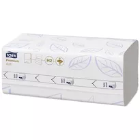 La toalla Tork Premium de tres paneles de alta calidad está hecha de dos capas de celulosa (una con tecnología TAD, la otra estándar). Las capas se unen con una mínima cantidad de pegamento incorporado a la estructura de la toalla en forma de patrón azul. La toalla es muy absorbente y gruesa, lo que garantiza una alta eficiencia y economía. Una hoja es suficiente para secarte bien las manos. La toalla plegada Tork Premium se recomienda para baños y cocinas de alto nivel: ha sido aprobada para el contacto con alimentos.