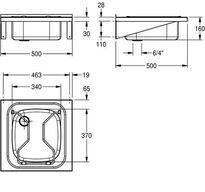 Universal wall-mounted utility compartment. Stainless steel, matt polished surfaces, material thickness 1.5 mm. Seamlessly welded basin with dimensions of 370 x 340 x 160 mm, rounded edges. 1 1/2˝ stopper drain with plastic overflow pipe, left. Rear wall edge 30 mm. Stainless steel grate with rubber bumper sleeves. The set includes stainless steel screws and wall plugs.