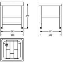 Stála technická miestnosť. Nerez, matne leštené povrchy, hrúbka materiálu 1 mm. Bezšvové zvárané, obklopené profilovaným okrajom kotliny s rozmermi 450 x 450 x 250 mm. Bez police na príslušenstvo. Hrana zadnej steny 50 mm. 1 1/2˝ odtokový uzáver s prepadovou rúrkou z nehrdzavejúcej ocele, vľavo. Výklopný nerezový rošt s gumenými manžetami nárazníkov. Rám s 300 mm vysokými zásterami, vzadu stabilizačná tyč. Pracovná výška 650 mm. Rám je privarený k nádrži. Nožičky 40 x 40 mm, výškovo nastaviteľné o 25 mm.