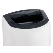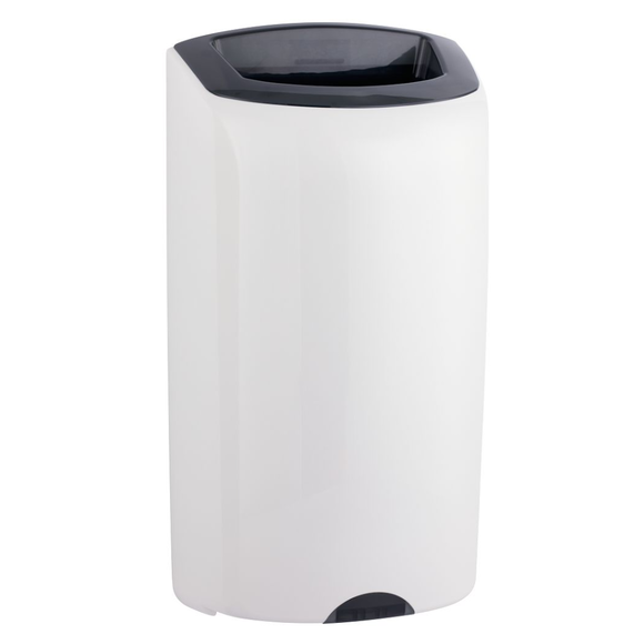 Wandhängender Abfallbehälter mit einem Fassungsvermögen von 40 Litern, hergestellt aus ABS-Material höchster Qualität. Der weiße Abfalleimer mit grauem Kragen ist mit einem Schloss zum Öffnen des Gehäuses und einem Rahmen zur Befestigung des Beutels ausgestattet.
