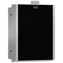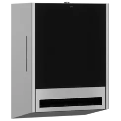 Der Toilettenpapierspender der Franke EXOS-Serie besteht aus 1,2 mm dickem Edelstahl. Auf der Vorderseite sehen wir eine dekorative schwarze Platte aus gehärtetem Glas. Es verfügt über eine innovative InoxPlus-Beschichtung, wodurch keine Handspuren auf der Oberfläche des Futterspenders sichtbar sind. Der Behälter fasst zwei Papierrollen, und wenn eine davon aufgebraucht ist, wird die zweite unsichtbare Rolle automatisch freigegeben. Der verdeckte Papierspender von Franke ist ein Spitzenprodukt für anspruchsvolle Toiletten.