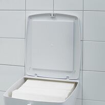 ZZ Einweg-Papierhandtuchspender mit einer Kapazität von bis zu 400 Blatt, vorgesehen für den Einsatz an öffentlichen Orten (Toiletten, Gesundheitswesen, Gastronomie). Hergestellt aus strapazierfähigem weißem ABS-Kunststoff, kompatibel mit Universal-Papierhandtüchern mit Blattmaßen von 25 x 23 cm. Der Behälter verfügt über einen Verschluss und einen Sucher zur Kontrolle der Restmenge der Patrone.