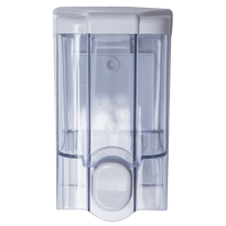 A small soap dispenser with a capacity of 500 ml made of ABS plastic, suitable for public utility facilities, such as: toilets, kitchens, offices, social facilities, etc. The soap dispenser comes from the JET series, which is characterized by a transparent casing and which has received a hygienic certificate from the National Institute of Public Health (PZH). The soap dispenser is permanently attached to the wall and any liquid soap can be used