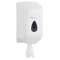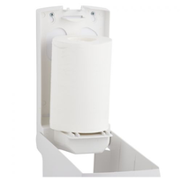 MERIDA TOP MINI disposable towel roll dispenser, white with a gray window. The plastic dispenser is equipped with a reducer that prevents the towels from falling out spontaneously. The control window shows the amount of cartridge.