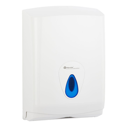 El elegante equipamiento de baño Merida TOP MEGA Maxi tiene una carcasa blanca y una llamativa ventana de color azul claro para comprobar los consumibles del interior. La ventana te permite comprobar fácilmente la cantidad del rollo sin tener que abrirla.