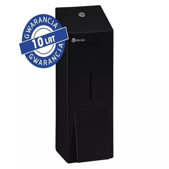 El dosificador MERIDA STELLA BLACK LINE está fabricado en acero inoxidable, lo que garantiza durabilidad y resistencia a daños. La superficie pintada de negro añade elegancia, lo que hace que el dispositivo se adapte perfectamente a interiores modernos.