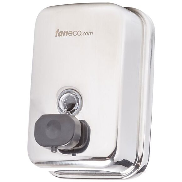 Made of stainless steel, polished finish, liquid soap dispenser with a capacity of 500 ml is designed for wall mounting. Suitable for public bathrooms and other public places. Equipped with a discreet control window informing about the soap dispenser running out.