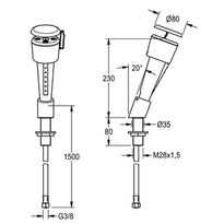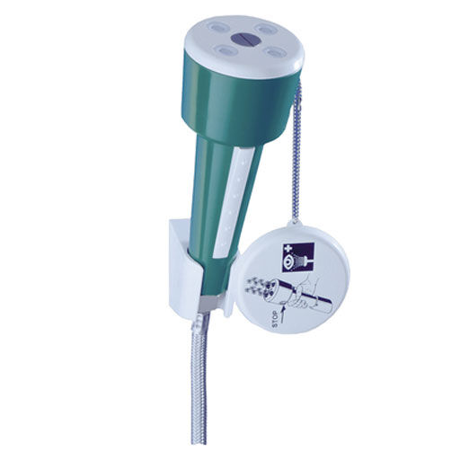 Vyplachovač očí namontovaný na doske. Zelené plastové puzdro, tlaková hadica pre stacionárne alebo mobilné použitie, chránené oceľovou výstužou. Mosadzná rukoväť pokrytá vrstvou bieleho ESP, namontovaná na doske. Zariadenie spĺňa požiadavky noriem EN15154-2 a ANSI Z35B.1-2014.