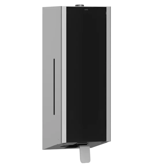 Dozownik mydła KWC EXOS wyróżnia się nowoczesnym designem, łącząc elegancką stal chromowo-niklową z czarnym szkłem hartowanym na przednim panelu. Satynowe wykończenie z powłoką InoxPlus nie tylko nadaje mu stylowy wygląd, ale również ułatwia utrzymanie czystości, zapobiegając pozostawianiu odcisków palców.