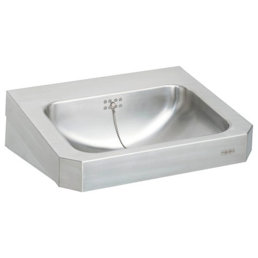 Wall-mounted sink. Stainless steel, matte brushed surface, material thickness 1 mm. Seamlessly welded basin into the countertop. Rectangular shape. Faucet shelf with a depth of 105 mm. Overflow. Plug waste and overflow set G 1 1/4 B, rear center drain. Front apron with 45° beveled corners. Welded wall brackets. Mounting according to EN 32. Includes: screws and wall plugs.